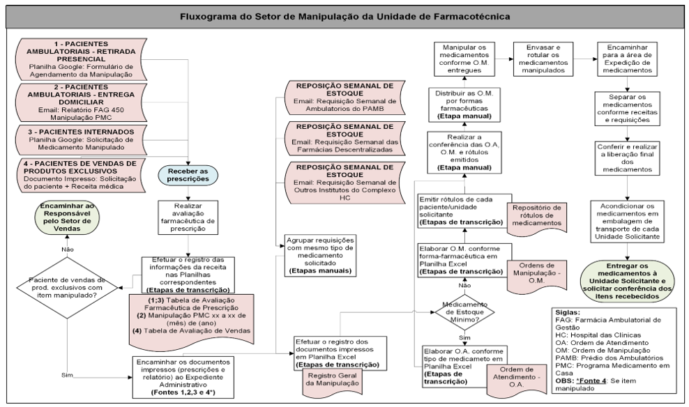 O Fluxograma do processo de manipulação está demonstrado na Figura 3 a seguir, com as fontes de informação obtidas, destacadas na cor rosa: