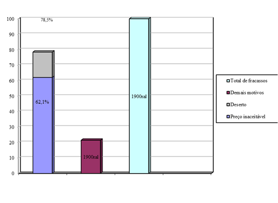 A ausência de propostas, denominada de deserto, foi a segunda maior causa de fracassos na compra, resultando em 80 (16,40%) itens não comprados. Dentre os motivos que podem acarretar em deserto, pode-se considerar o desconhecimento da licitação por parte do fornecedor, a falta de interesse em fornecer os quantitativos estimados em edital pela administração pública (pequenas quantidades ou quantitativos extremamente altos) e desinteresse em participar por insucessos anteriores em virtude da dificuldade de atingir o preço desejado pela administração pública.