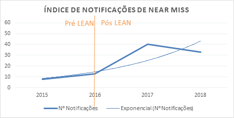 A implantação de ferramentas LEAN trata-se não apenas de uma gestão de ferramentas da qualidade, mas sim de mudança na filosofia e cultura requerendo muito envolvimento dos colaboradores e diretoria. O processo iniciou-se com coleta de informações do cenário atual, onde foram apuradas informações relevantes ao alvo do projeto. Nesta etapa pudemos notar que o número de notificações de near miss anual era muito baixo, em 2015 um total de oito notificações e em 2016 um total de treze; índices muito baixos para um atendimento hospitalar 24 horas (Figura 4).