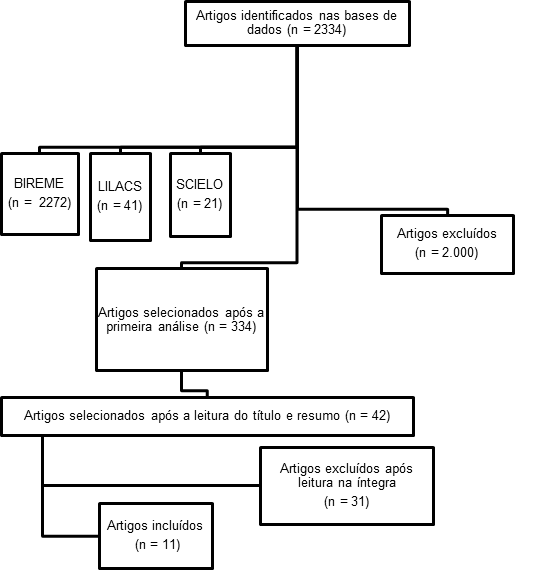 Os resultados obtidos depois de busca nas bases de dados foram 2334 textos, sendo 2272 na BIREME, 41 na LILACS e 21 na SciELO, desses 2000 foram excluídos após a primeira análise e 334 encontraram-se dentro dos critérios de inclusão da primeira análise, após a leitura do título e resumo e uma segunda análise foram selecionados 42 artigos, esses foram lidos na integra e obteve-se ao final uma amostra de 11 textos, estas características são evidenciadas na Figura 1