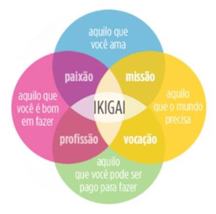 Marc Winn propôs em 2014 um diagrama para representar o ikigai (Figura 1) 20. Esta figura é composta por quatro círculos onde na intersecção, ao centro, encontra-se o ikigai. Os quatro círculos representam os quatro princípios: a paixão, a missão, a profissão e a vocação. A paixão pode ser percebida ao se responder à pergunta: o que você ama? A missão vem como resposta à pergunta: do que o mundo precisa? A profissão e os talentos pessoais e profissionais são revelados respondendo: em que você é bom? Conhece-se a vocação respondendo à: por qual tarefa você gostaria de ser pago para fazer?