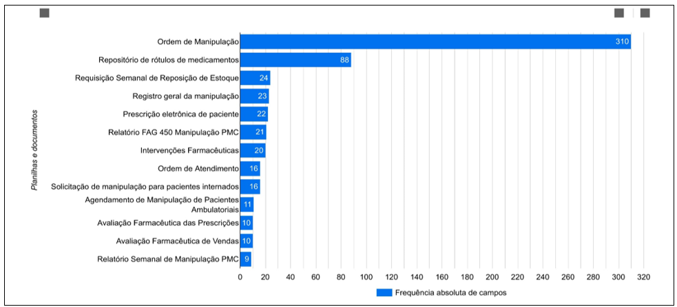Na Figura 4 é possível verificar que as planilhas de “Ordem de Manipulação” tiveram o maior valor absoluto, com 310 campos, seguida por “Repositório de Rótulos de Medicamentos”, obtendo um valor absoluto de 88 campos. demonstrando que são documentos com informações críticas para viabilidade de fluidez do processo.