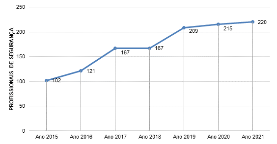 Para isso, como poderá ser observado a seguir no Gráfico 1, entre os anos de 2015 e 2021, a instituição ampliou seu quadro operacional de agentes responsáveis pela segurança organizacional em cerca de 104%.
