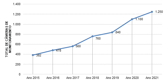 Composta por uma equipe altamente especializada para supervisão digital de ambientes, essa unidade é responsável pela gestão operacional de um parque composto por 1.250 câmeras, montante que representa um crescimento próximo a 330% com indica a seguir o Gráfico 2.